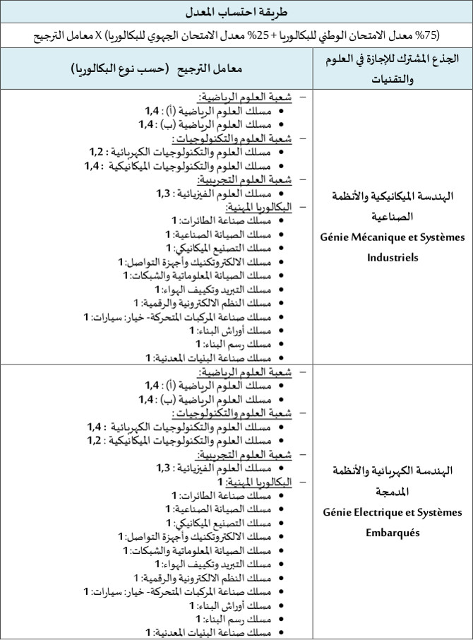 يشترط في المترشح أن يكون حاصلا على شهادة البكالوريا برسم السنة الفارطة أو مسجلا بالسنة الختامية من سلك البكالوريا.وتجدر الإشارة إلى أن نوع البكالوريا المطلوبة تتوقف على الجذع المشترك المترشح له :